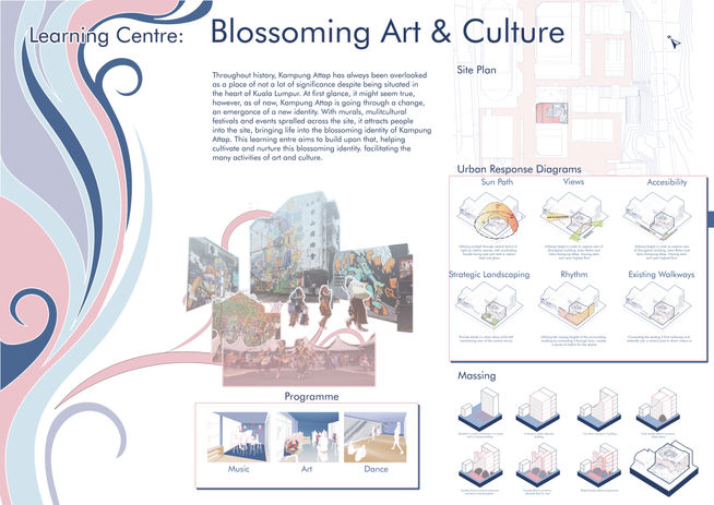 This learning centre, situated in the heart of Kampung Attap, aims to be a statement building within the site, meant ti symbolise and facilate the growing arts and culture emerging within Kampung Attap.